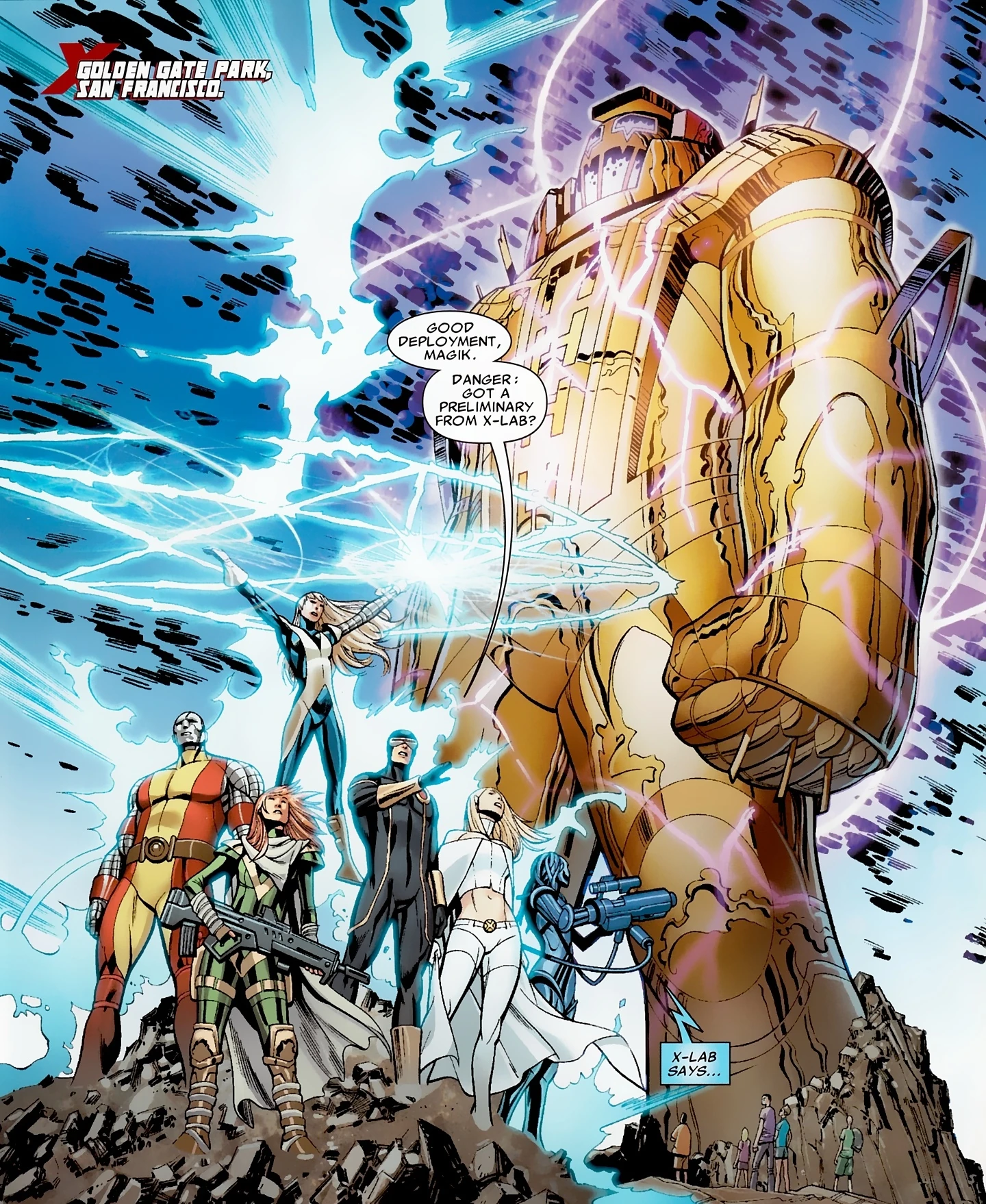 In 2011, after two weeks of no engagements, the first threat faced by the Extinction Team came when Agent Abigail Brand of S.W.O.R.D. reported strange activity from the Dreaming Celestial that stood by the Golden Gate Bridge in San Fransisco. Using Magick's power, they teleported to the site and detected anomalous readings. This saw the head of the Celestial suddenly lift off from its body where it moulded its blank face into that of Mr. Sinister who had entered inside of it and taken control. He spoke to Summers telepathically and informed him that he intended to oblige him in giving the first real challenge to the Extinction Team. This saw the entire team being assembled who engaged the Dreaming Celestial only to see the head relocate to a separate point in the city where Essex used its power to reconstruct the area to turn everyone into a version of Mr. Sinister. As they battled the various copies, they were told that a Celestial Host were coming to Earth to investigate the violation done to one of their own. One of the copies of Mr. Sinister offered an armistice and summoned the Extinction Team to the rotunda to meet with Essex himself. Once they met with him, he revealed that he cared little for the coming Celestials who would wipe out the inhabitants of the planet but allow Mr. Sinister's clone species to survive.