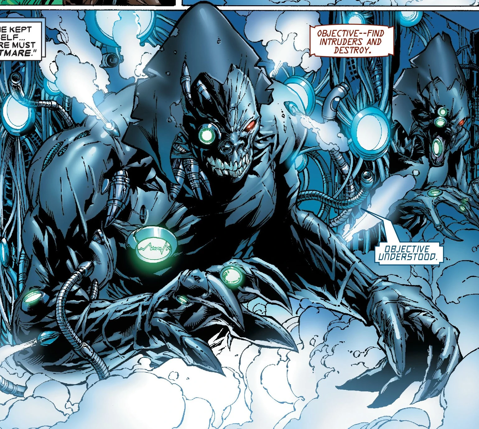 The Imperial Shockers were cyborg warriors of the Shi'ar Empire that were experiments conducted on prisoners that turned them into lethal killing machines. These individuals were forcibly put through the process and stationed at secret facilities to be activated in cases where intruders had entered Shi'ar installations. Upon awakened, they were deployed on assignments and kept alive through a device in their brain despite their own desire for death to escape this punishment. Imperial Shockers did not feel pain and were equipped with optical scanners to register the level of threat from their enemies and were fast enough to battle strong Mutants. They also had the ability to discharge energy blasts that inflicted a collapsing energy field on a target designed to kill them.
