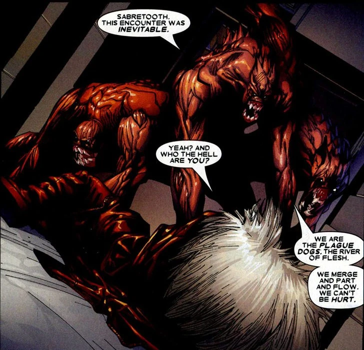 The Plague Dogs were three subordinates of Dr. Richard Palance after he became the supervillain Pandemic. This was when he studied the X-Gene in the Mutant Rogue and decided to cultivate it with various viral strains in order to attain a means of obtaining immortality by absorbing their experiences. During this time, he experimented with numerous viral strains which led to the creation of one that was used to create the Plague Dogs who's bodies were transformed into rivers of flesh. These three individuals were able to merge, part and flow thus allowing them to reform their bodies from any injury. Thus, they believed that they were incapable of being harmed as they simply reformed their flesh and heal themselves which removed them from the normal Human genetic template. In addition, they were immune to Rogue's Mutant ability to absorb memories and abilities from people through skin contact. Following the test of this strain, Dr. Palance was able to create the Strain 87 Virus which he used to instill within himself the power to absorb Mutant abilities though this did not provide him with his objective in attaining a form of immortality by stealing subjective experiences from other people.