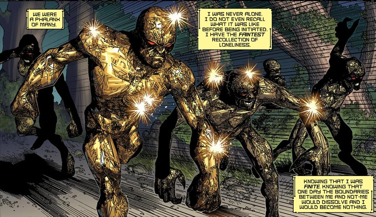 The Phalanx came to believe that his only hope for re-experiencing the hive mind was through renewed contact with the rest of Strain 264 Theta to cure him of this malady. In that time, the specimen disguised himself as the assimilated family members in the town to prevent suspicion from falling on his detection. At this time, the specimen decided to absorb more bio-mass into his body to become a stronger transmitter towards his people and ultimately agreed to become a Babel Spire to achieve his goal. Thus, the specimen decided to kill the inhabitants of the town to absorb more bio-mass. This was a task that the member of Strain 264 Theta did not enjoy killing beings but decided that their lives were insiginicant to the greatness of the hive mind. He reasoned that whilst unfortunate, it was a necessary task and that he would pay this debt once he was cured of his malady. He became obsessed and added more bodies to its Techno-Organic form with no thought about revenge against Essex but of restoring its ability. However, the larger mass created an energy-vent that was unanticipated and despite shutting this down, the signature of the Phalanx was detected at The Peak by Abigail Brand. Knowing that a response was expected, the specimen knew they would expect him to hide but his large form meant that he abandoned subtlety to feed on the town.